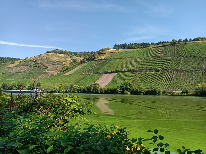 Weinberge bei Trier, Mosel sehr grün von Blaualgen